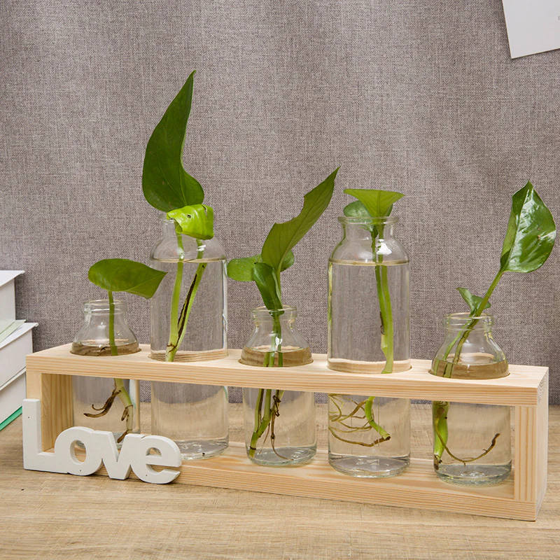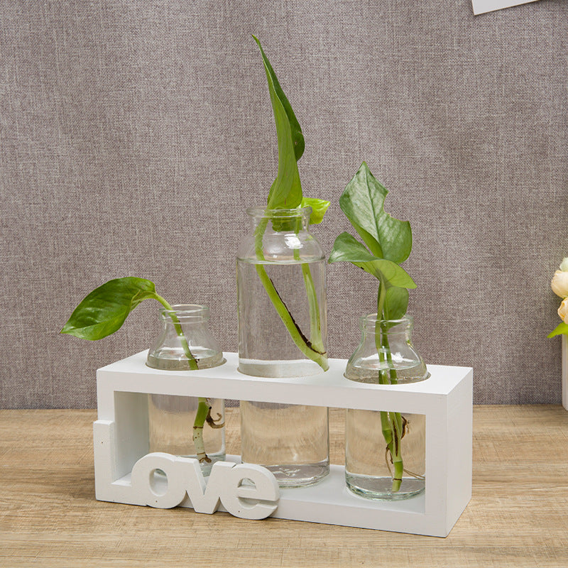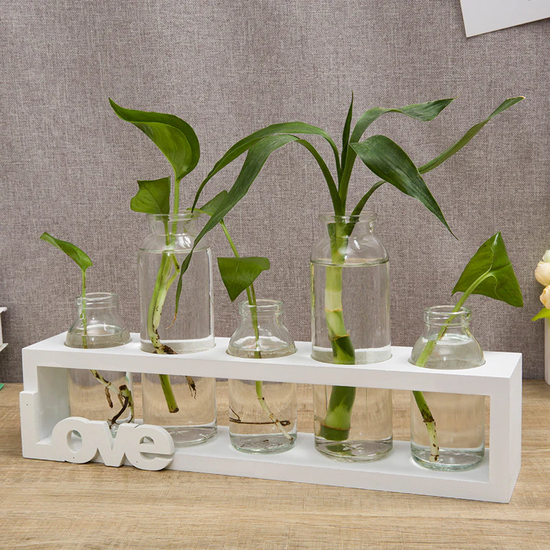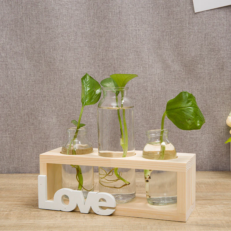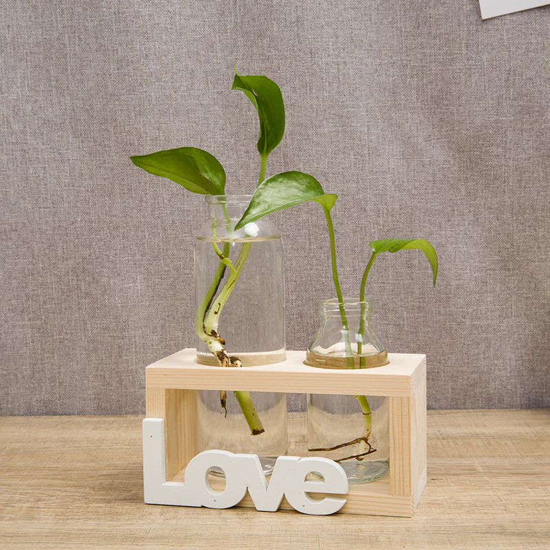 This wooden "Love" vase holder with hydroponic tubes is perfect for a kitchen or sitting room by a window. An excellent way to start fresh herbs for your garden or to keep fresh herbs in your kitchen.